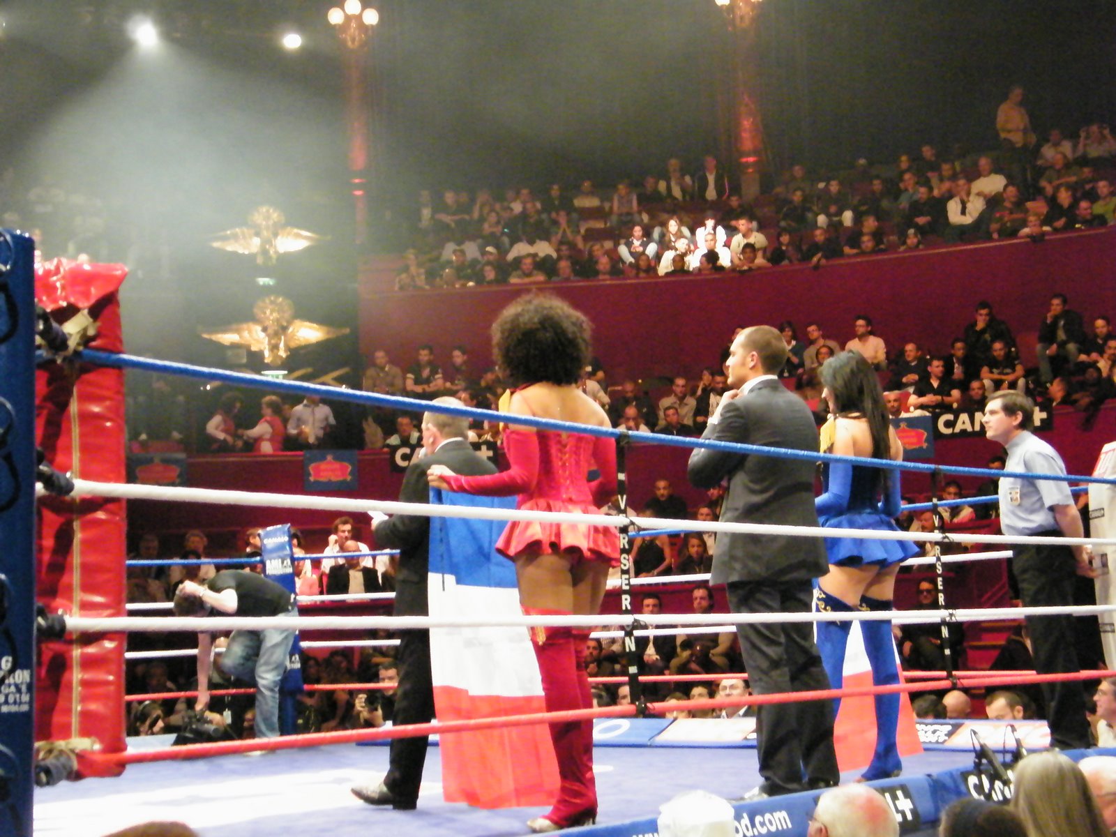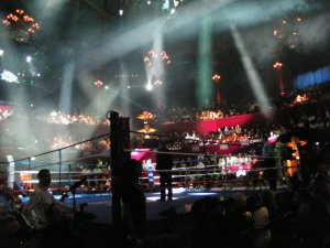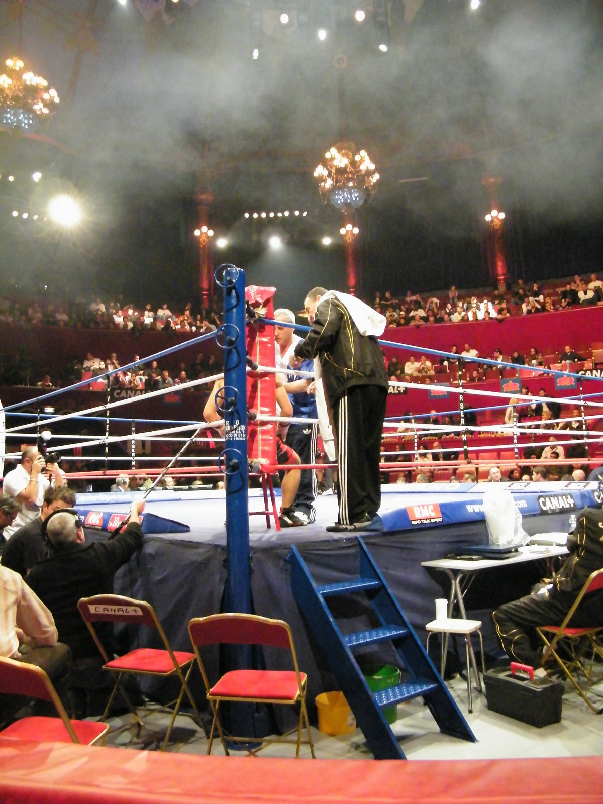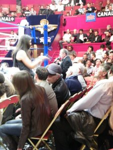 Le coach de mon chéri nous a vraiment choisi des places très bien placées. Nous étions juste derrière un des angles du ring, là où les boxeurs s’assoient lors des combats. Et tout cela à moins d’un mètre de nous…