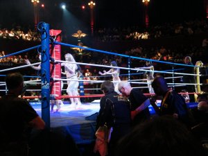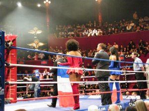 Pour « ouvrir » la soirée boxe, un vrai show à l’américaine : danseuses, fumée, musique, … et à chaque reprises un défilé de pompom girls !
