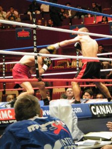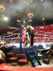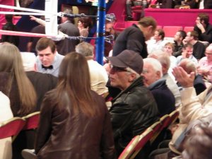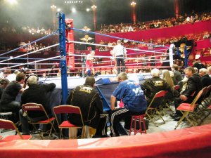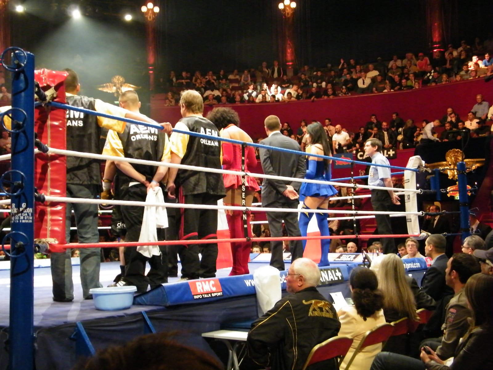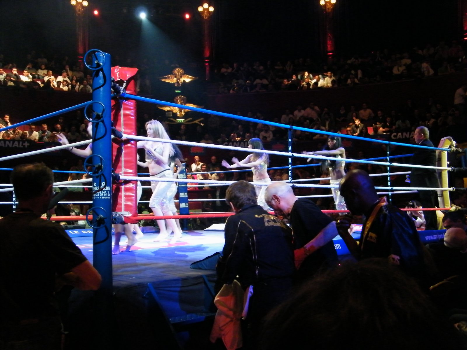 A 21h30, après 3 combats, le présentateur (M. Allouche, qui est également le papa du coach) nous indique que la diffusion de la soirée boxe sur Canal + va commencer… C’est-à-dire que les combats vont être retransmis en direct… Et oui la class…