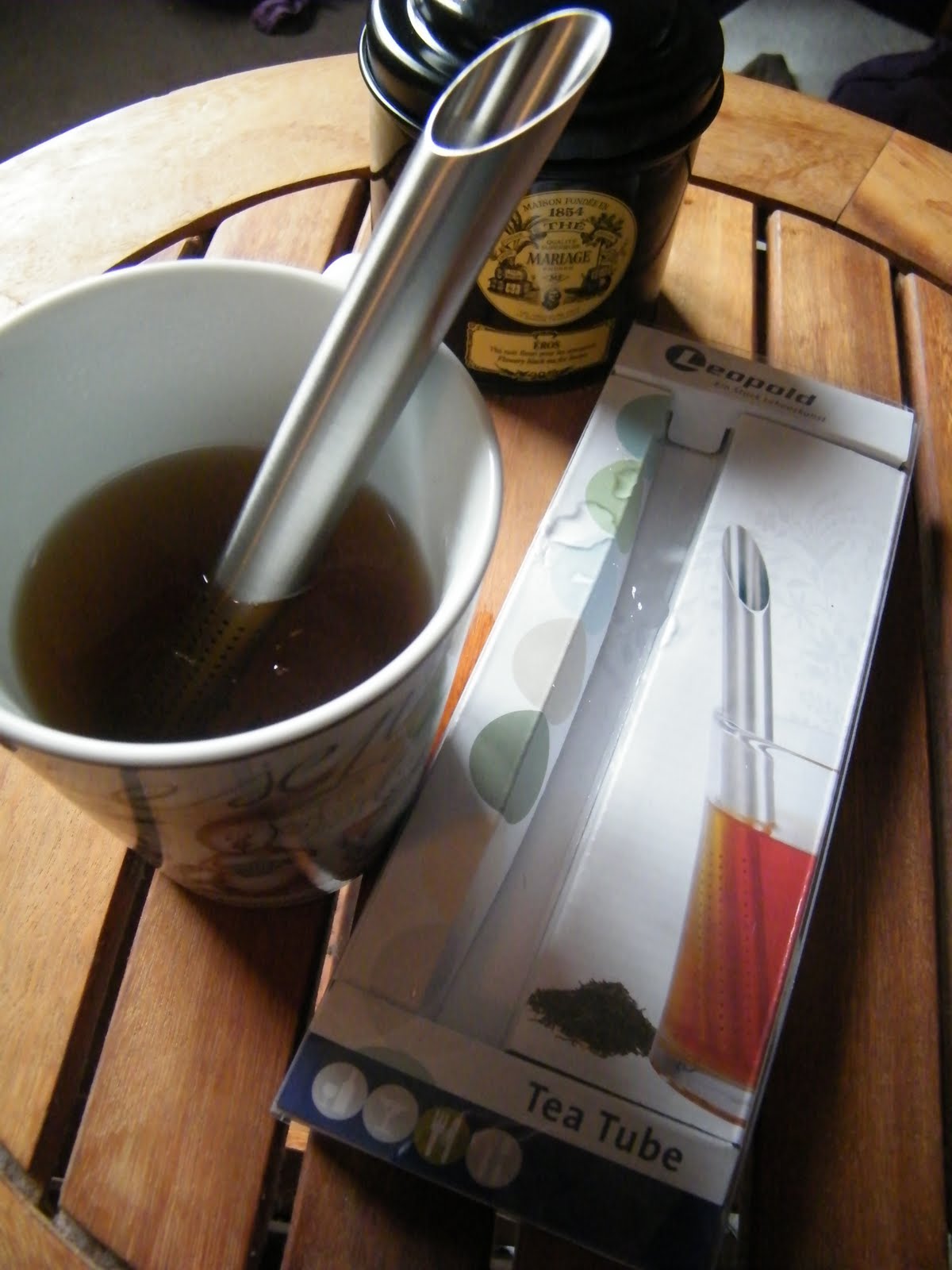 Ma collection d’objets utiles à la dégustation de thé aussi : la sublime théière transparente de chez Bodum avec le réservoir transparent, les tasses à thé, la bouilloire, les mugs, les cuillères à thé et ma dernière trouvaille : le tube à thé de chez Leopold !