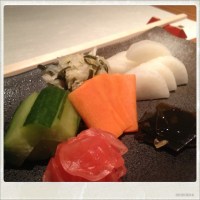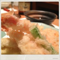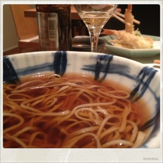 Ma sélection était moins exotique … Une entrée à partager, « Ohitashi » (légumes de saison marinés) puis une petite formule « Tempura Soba » à 22,50€ comprenant des tempuras de crevettes & légumes et des pâtes soba (pâtes épaisses dans un bouillon).