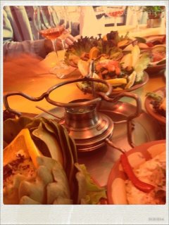Pour trois, une vingtaine de mezze chauds & froids, taboulé, hommous, fallafel, caviar d’aubergine, rikakat au fromage, fatayer aux épinards, etc… et ensuite, car oui ce n’est pas fini… on passe au plat… viandes cuisinés qui sont posés sur le réchaud : poulet mariné, boulette de viandes et foie de volaille.