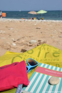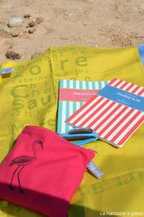 La pochette SHIFUMI, parfaite pour protéger lunettes de soleil, clefs ou monnaie du sable et ne pas les chercher partout dans le sac ; les carnets ALIBABETTE comme un air de cabine de plage de La Baule sur La Roda étaient de parfaits carnets de bord et … le torchon MOUTET … et bien oui ça peut toujours servir ? et le Muscadet avait envie de voir la mer et de rencontrer le Rioja …