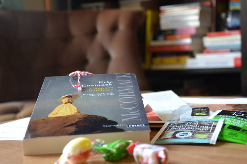 contient : un roman coup de coeur « L’Epouse Hollandaise » de McCormack, des bonbons et du thé.