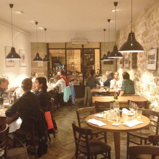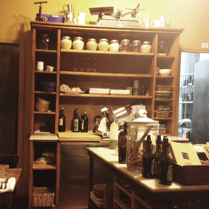 J’ai tout de suite été charmée par cette petite adresse mi-restaurant, mi-épicerie fine. Du parquet au sol, des tables en bois, pierres apparentes, des étagères de bouteilles de vin au mur … au centre une table toute pleine d’antispasti et fromages…