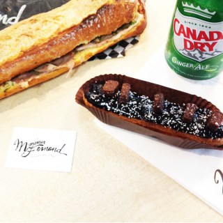 J’ai choisi un sandwich Gigot d’agneau de lait au pesto, tomates et mesclun (6€), absolument succulent ; avec un Canada Dry et un éclair au chocolat de Monsieur Michalak. Une merveille !