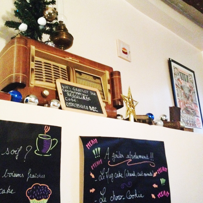 Les lieux semblent tout petits, en bas juste un comptoir et un immense tableau présentant les boissons et les gourmandises sucrées et salées ; puis à l’étage un salon cosy fais de divers fauteuils et tables.