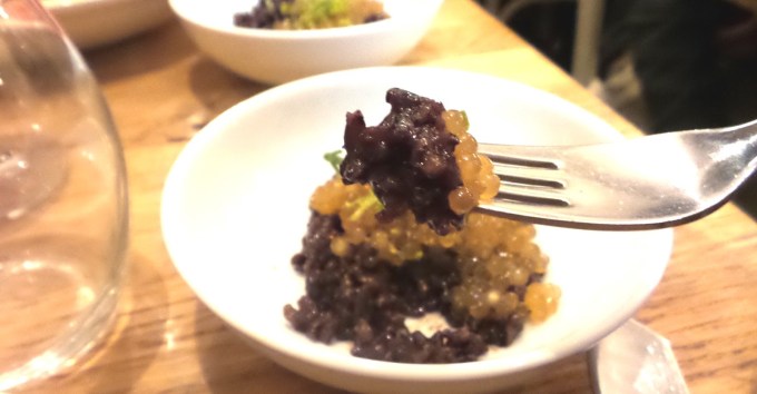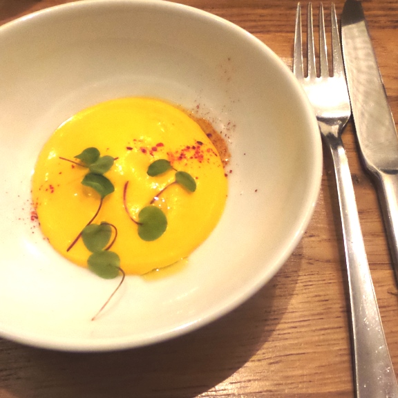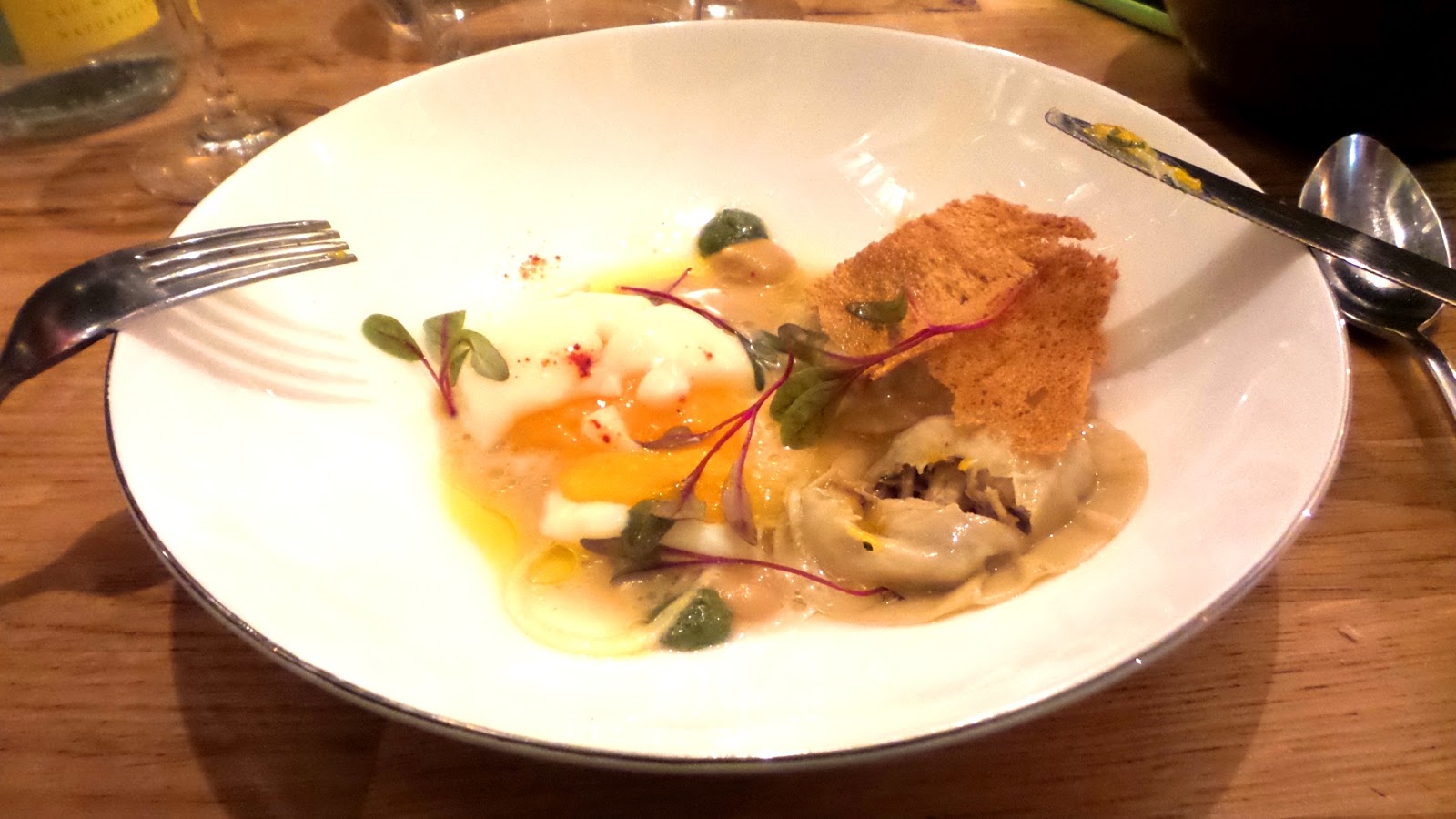S’en suit des plats tout aussi raffinés et savoureux. En entrée une raviole de chair de poule, bouillon de poule facon Chengua, coriandre, oignons nouveaux, et oeuf cuit basse température à pleurer de bonheur et qui reste mon coup de cœur de la soirée.