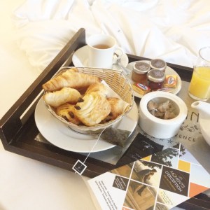 Et au réveil, tant qu’à vivre mon rêve de princesse, je le prends au lit après profiter d’un long bain dans ma baignoire … Et je suis ravie de ce copieux petit déjeuner : viennoiserie, mini cake maison, salades de fruits frais, confitures et jus de fruits Alain Millat, … du pur bonheur !