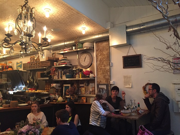 Au fond d’une jolie cour de la Rue des Saints Pères se cache un petit cottage anglais très cosy. Des tables en bois, des fleurs, des citrouilles et de magnifiques accents américains (ou anglais) qui fleurissent partout dans le salon.