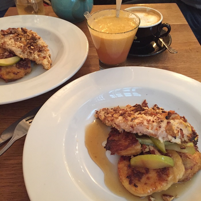 Le jus du jour –orange, pomme, carotte, gingembre– pressé à la demande est délicieux. Ensuite j’ai choisi le poulet fris et son pain perdu, un pure délice copieux, tendre et savoureux et pourtant je n’aurai jamais imaginé un poulet sucré-salé 🙂