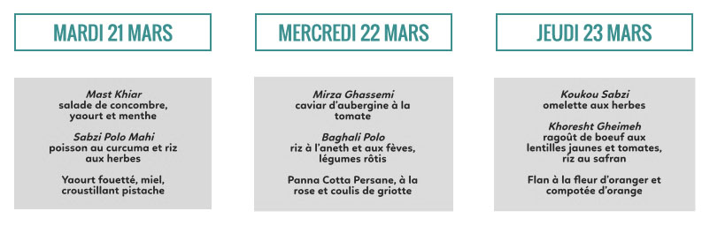 A cette occasion, Patrick Asdagh, fondateur de FoodChéri, s’est associé au chef Sam Tavassoli du restaurant Mazeh pour nous proposer trois menus de fête à découvrir en ce moment : un menu de fête, un menu végétarien et un menu traditionnel populaire.
