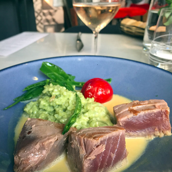 Thon mi-cuit, emulsion passion & risotto crémeux